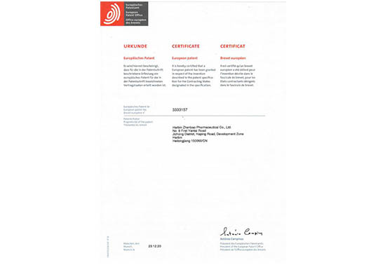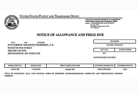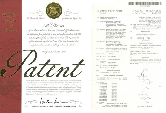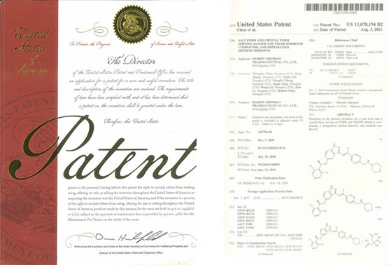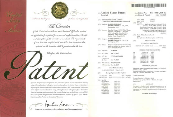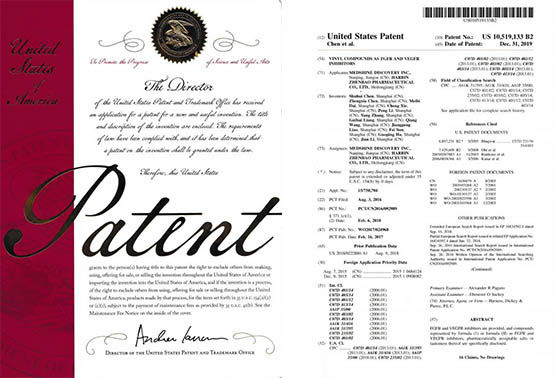 國(guó)內(nèi)發(fā)明專利通過PCT途徑,創(chuàng)新藥在多個(gè)國(guó)家獲得專利授權(quán),《作為FGFR和VEGFR抑制劑的乙烯基化合物》已獲得美國(guó)、歐洲、日本授權(quán);《作為Akt抑制劑的二氫吡唑氮雜卓類化合物》已獲得美國(guó)、歐洲、日本、韓國(guó)授權(quán);《作為Akt抑制劑的鹽型及其晶型》已獲得美國(guó)、日本、韓國(guó)和歐洲授權(quán);《穿心蓮內(nèi)酯改構(gòu)化合物》獲得美國(guó)授權(quán);《一種穿心蓮內(nèi)酯改構(gòu)化合物的鹽型、晶型及其制備方法》已獲得美國(guó)、歐洲授權(quán);《一種作為FGFR和VEGFR抑制劑化合物的鹽型、晶型及其制備方法》已獲得美國(guó)、歐洲、日本授權(quán)。